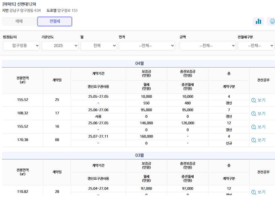 > 전용면적, 거래금액, 층수, 거래일자가 나옵니다